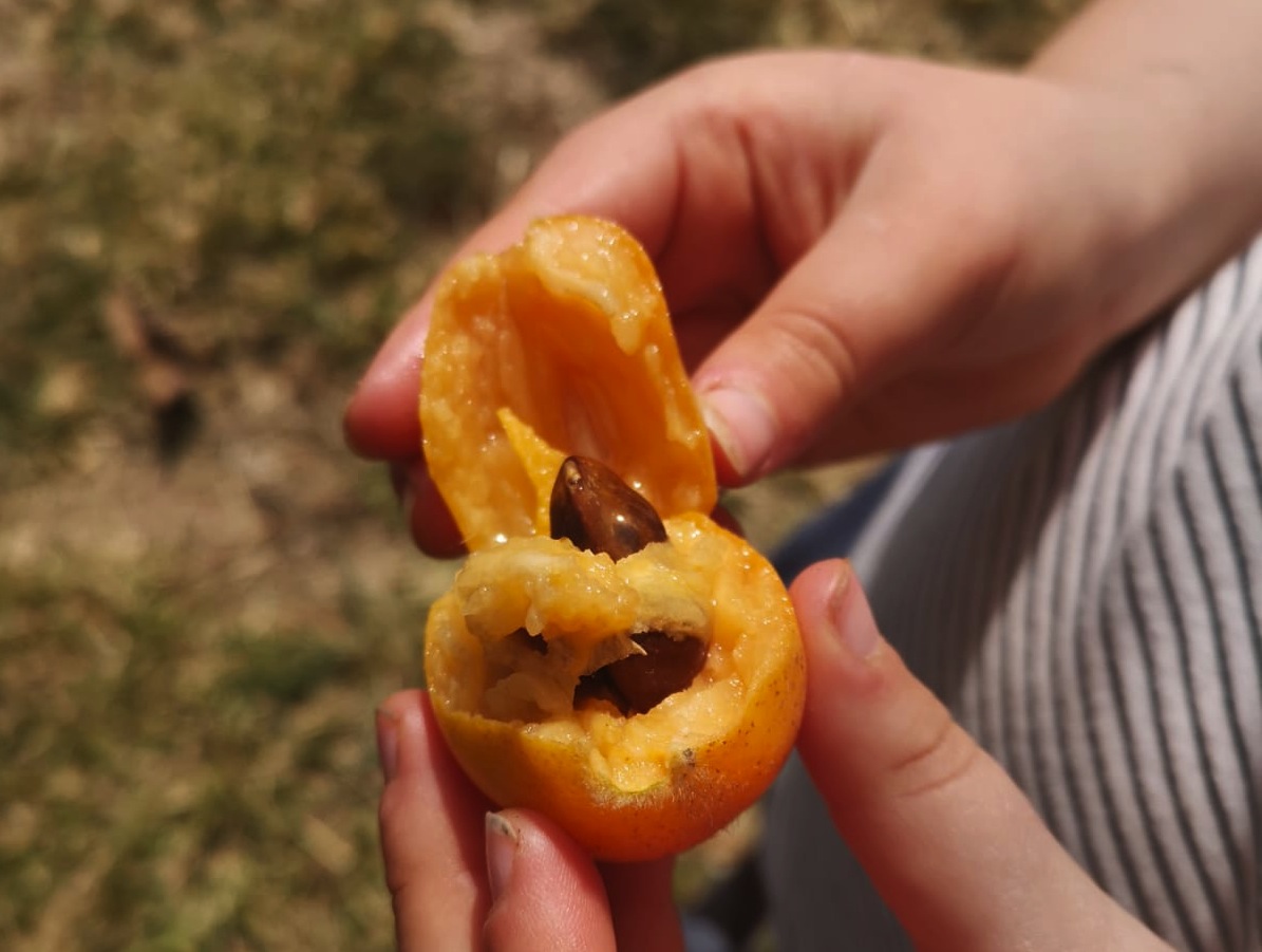 We spent a while in the orchard looking at the fruit trees in different stages of blossom. There are still a couple of incognitos that didn’t produce fruit last year, so we’re not sure what they are. We have one tree that over the last couple of weeks has produced dozens of succulent little orange fruit (in the picture above). Apparently these are loquats – still a bit sharp, but we’re hoping they get sweeter. We also looked at where we’ll put the yurt that we’re planning to set up, and where the composting loo will go. We still have a lot of research to do on both of these.